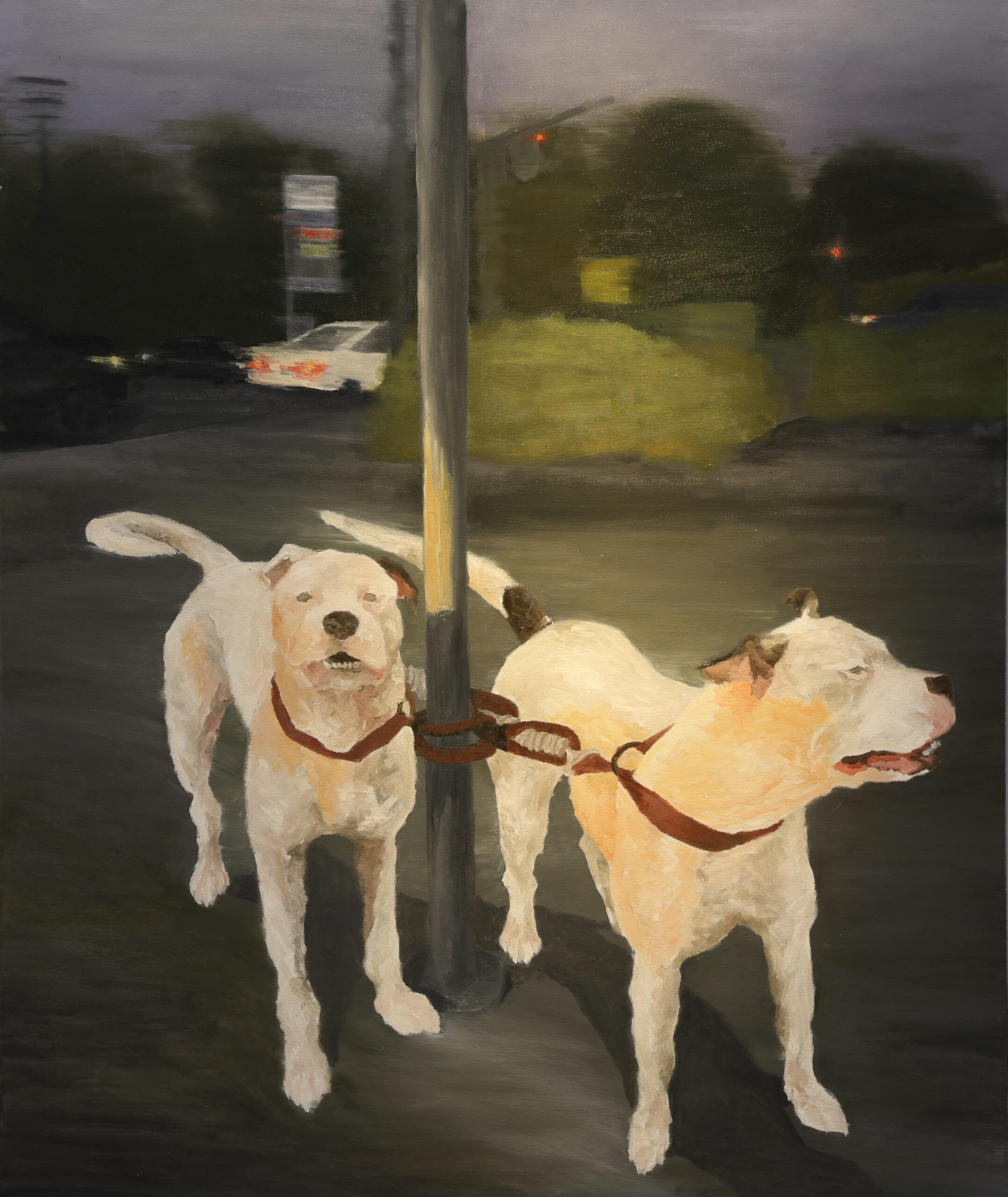 V času, v katerem živimo, nimamo več jasnih smeri, prihaja do nasprotij, kjer se stvari, ki so bile nekoč varne, danes postavljajo pod vprašaj. Simbol tega strahu in negotovosti je upodobljen v ospredju z dvema psoma, privezanima na javno razsvetljavo, ki prežita na gledalca. S tem je gledalec postavljen v vlogo morebitnega plena. Utesnjenost in nemoč sta jasno prikazana tudi skozi nasprotje dogajanja v ozadju, ki prikazuje vsakdanjo rutino, ter prvinsko nevarnost, ki tiho preži na nas.