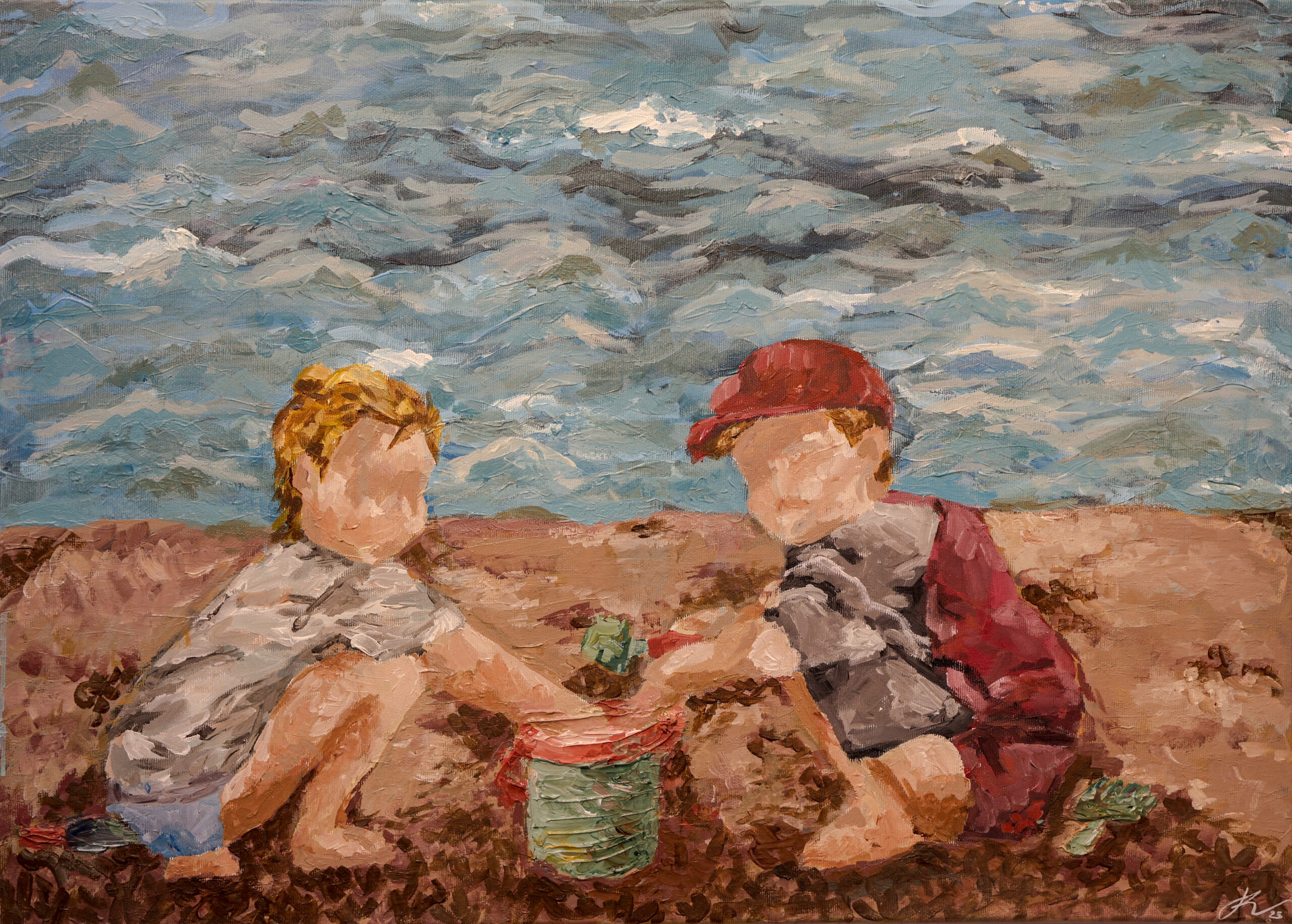 Otroštvo je obdobje, ki nam pušča sledi kot temelj za razvoj posameznika v kasnejšem življenjskem obdobju. Otroštvo na sliki je spreminjajoče, razosebljeno in figuri otrok sedita na pesku v okolju, kjer naj bi otroci sedeli. Vendar v njunih telesih in obrazih ni lahkotnosti igre, temveč občutek praznine in tihe odtujenosti. Prostor, ki bi moral izražati toplino in varnost, je preoblikovan v prizorišče negotovosti, kjer je prisotna hladnost. Brezizraznost lahko interpretiramo tudi kot stanje prihodnje generacije otrok. Slika tako odpira vprašanje, kako današnji svet vpliva na oblikovanje otroštva in na vrednote, ki jih prenašamo naprej. V tem kontekstu postane umetniška interpretacija opozorilo in hkrati povabilo k razmisleku o odgovornosti družbe do odraščanja.
